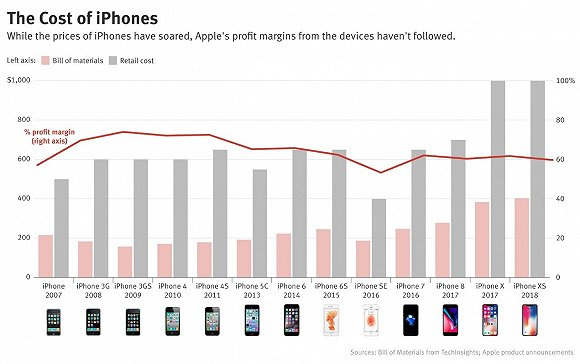 值得注意的是,即使利润率有所下降,但在iPhone X这样的价格比较贵的手机上,苹果公司的毛利润 (每部手机零售价减去成本得出的金额)却大幅增加了。