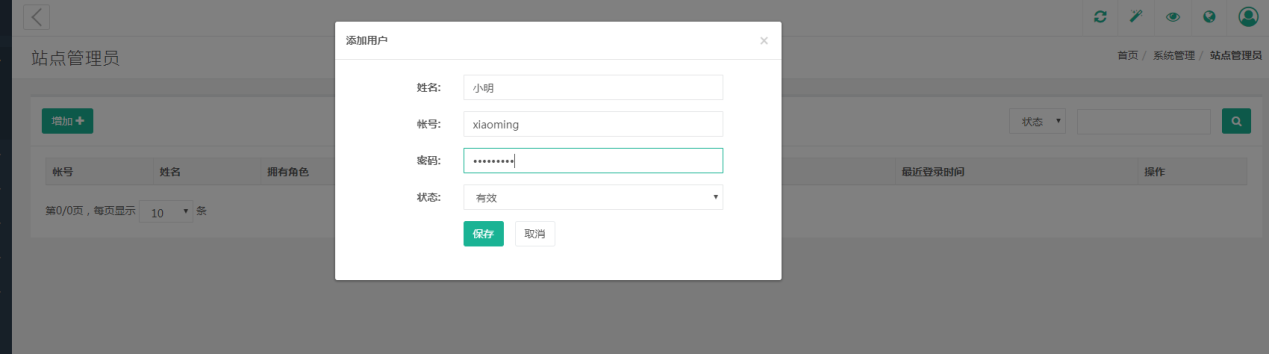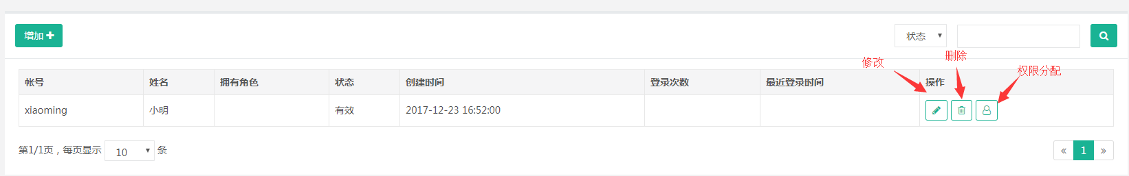 二、管理员添加成功后展现方式如下图列表,并可进行修改、删除、权限分配