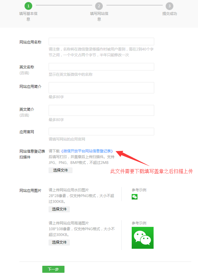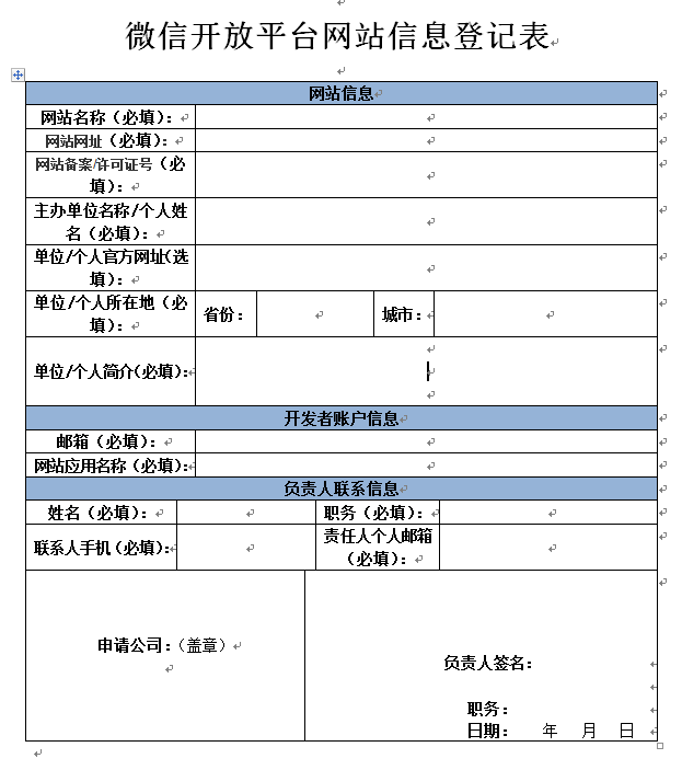 微信开放平台网站信息登记表,此文件需要下载填写、盖章之后扫描上传