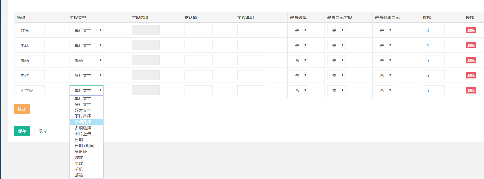表单字段设置,您可以自己自定义表单字段,可以设置先后顺序,配置相应的字段等等。